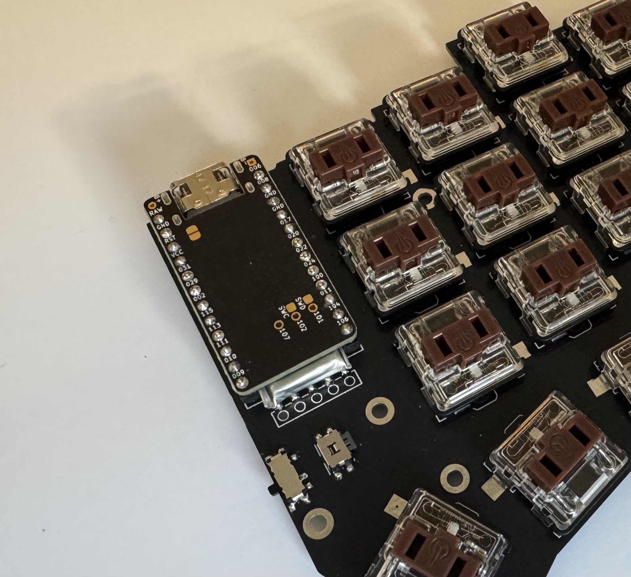 Anyway, there’s a guide linked in the README, which I followed.[7] The big idea is to solder while the pins, sockets, and nice!nano are in place (to make sure everything will fit), but to use a bit of painter’s tape to prevent solder from leaking through and sticking everything together.